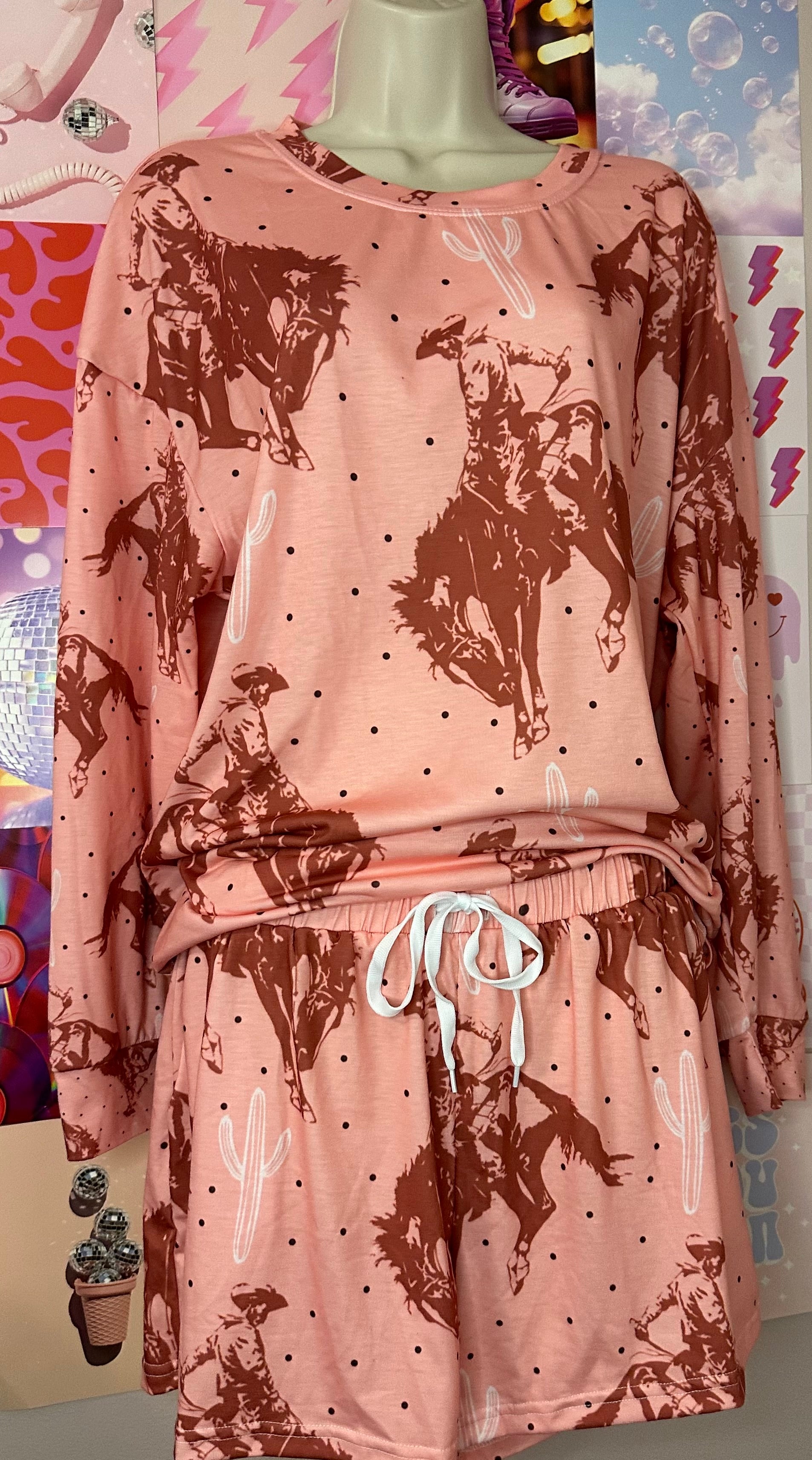 Have a good night with this loungewear set! Two piece pajamas set include a long sleeve blouse top and a high waist shorts